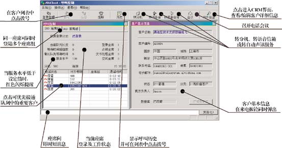 | 撥出電話(huà):查電話(huà)號(hào)碼-〉 鍵入號(hào)碼-〉 等待 | 鼠標(biāo)雙擊客戶(hù)信息表格上的客戶(hù)名,自動(dòng)撥出、接通 |