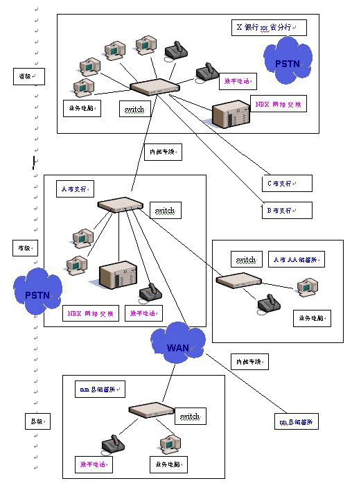 將省、市級分行原來使用的普通電話線路與NBX網(wǎng)絡交換機相連,那么全省各地儲蓄所的數(shù)字話機就可以撥打全省系統(tǒng)以外的普通電話。因為各個縣市區(qū)之間是均有專線相連,所以各市區(qū)異地撥叫只有市話部分是使用郵電局線路,長途線路以內(nèi)部數(shù)據(jù)網(wǎng)代替,因此長途業(yè)務只需繳納市話費就可以。