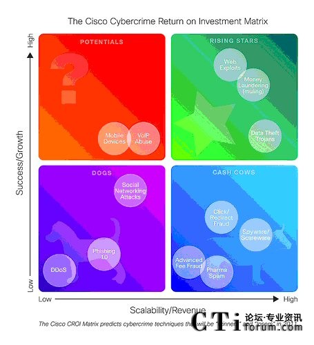 通過(guò)思科CROI矩陣對(duì)網(wǎng)絡(luò)犯罪類(lèi)型的分析,思科安全專家預(yù)測(cè):在2011年,以獲得非法利益為目的的網(wǎng)絡(luò)犯罪將會(huì)分流他們的資源。