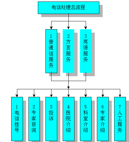用戶撥號接入醫(yī)院呼叫中心后,系統自動向用戶播放語音提示:"您好,歡迎使用本醫(yī)院的電話服務中心,普通話服務請按1,方言(廣東話)服務按2,英語服務按3。"
