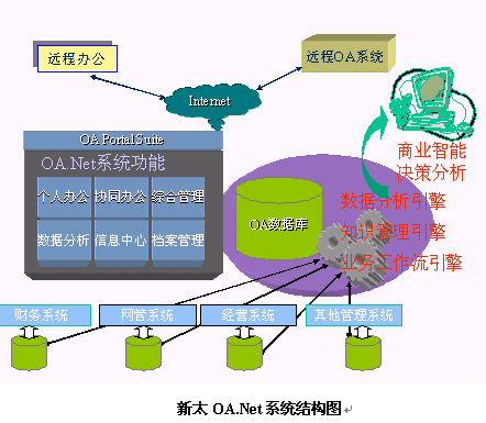 新太OA.Net系統(tǒng)基于最新的B/S三層體系結(jié)構(gòu)開發(fā),采用關(guān)系型數(shù)據(jù)庫(SQL Server,Oracle等)結(jié)合群件系統(tǒng)(Exchange、Domino等)的方式,在保證系統(tǒng)高穩(wěn)定性的基礎(chǔ)上充分發(fā)揮了系統(tǒng)的靈活性?蛻舳嘶跒g覽器,無需安裝軟件,版本自動更新到客戶端,大大降低了系統(tǒng)維護的難度。