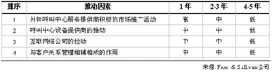 表二羅列了推動(dòng)中國(guó)外包呼叫中心服務(wù)市場(chǎng)發(fā)展的主要因素。