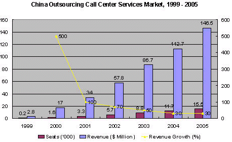 Frost & Sullivan公司研究表明在2000年,中國(guó)外包呼叫中心服務(wù)市場(chǎng)價(jià)值1700萬(wàn)美元,共有1600坐席。本座席數(shù)是按照實(shí)際工作量來(lái)計(jì)算的,物理上存在的坐席數(shù)要超過2300個(gè)。因?yàn)樵S多坐席是在2000年下半年末才建成投入使用的,并且工作任務(wù)也沒有滿負(fù)荷。