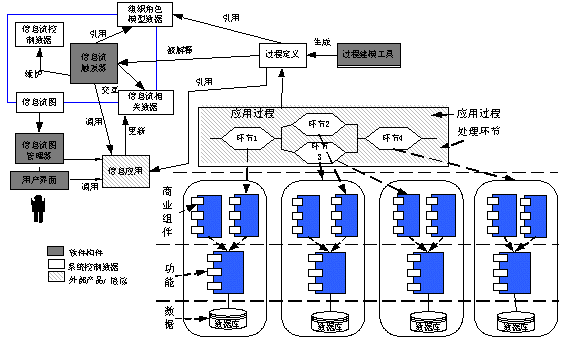 一體化信息平臺的總體結(jié)構(gòu)大體上分為數(shù)據(jù)層、功能、商業(yè)組件、處理環(huán)節(jié)、應用過程層,功能層提供基本的基礎功能和商業(yè)功能元件,商業(yè)組件封裝了相關(guān)的數(shù)據(jù)和功能元件,可以被客戶關(guān)系管理系統(tǒng)各環(huán)節(jié)調(diào)用,通過以客戶為中心的信息流管理控制順序執(zhí)行處理環(huán)節(jié),實現(xiàn)商業(yè)過程。