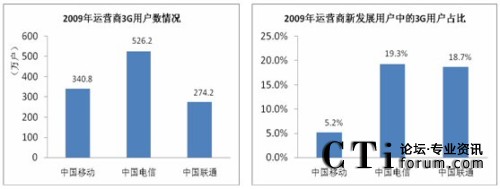 截止2009年12月底,三大運(yùn)營(yíng)商3G用戶(hù)數(shù)累計(jì)達(dá)到約1141萬(wàn)戶(hù),在移動(dòng)通信用戶(hù)中的占比為1.5%。在三大運(yùn)營(yíng)商中,中國(guó)電信3G用戶(hù)數(shù)最大,達(dá)到526.2萬(wàn);中國(guó)電信和中國(guó)聯(lián)通的新發(fā)展用戶(hù)中3G用戶(hù)相對(duì)較高,均在19%左右;中國(guó)移動(dòng)在3G用戶(hù)發(fā)展方面,暫時(shí)落后。