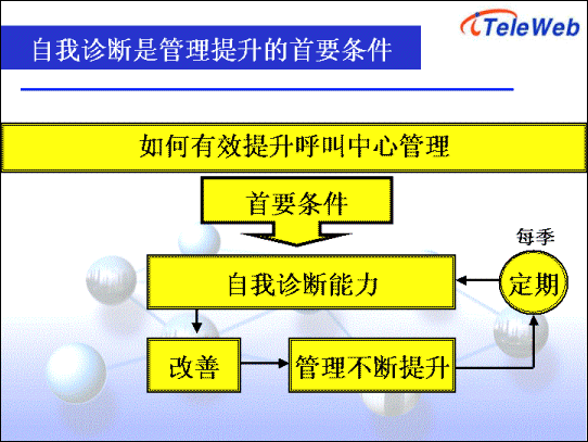 在如何提升呼叫中心運營管理中,自我診斷是首要步驟。通過對現有管理流程的診斷,找出需要改進的項目以及空間,從而評估與呼叫中心整體營運目標是否相符。同時透過與整體組織架構,同業(yè)比較以及標準基準,即可找出需要改進的地方。