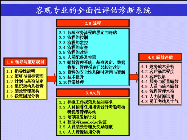 此評估診斷系統(tǒng)以1.0領導與決策規(guī)劃為起始點,作為建立一個以客戶為核心的高質量客戶服務中心的推動根源,并且制定了一個良好的4.0績效評估系統(tǒng),以確保經營目標與標準質量基準能確實達成,此過程需透過嚴謹的流程設計和高效的人員管理去執(zhí)行這套運營體系。