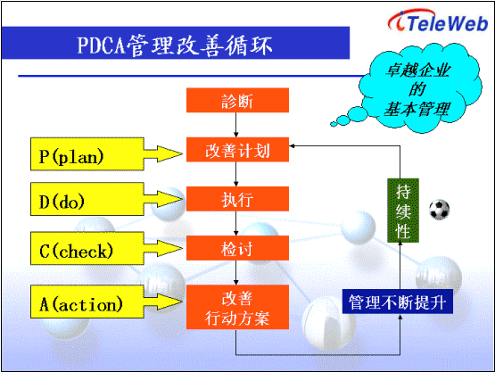 2) PDCA的流程,即診斷、改善計劃、執(zhí)行、檢討以及改善行動方案等。