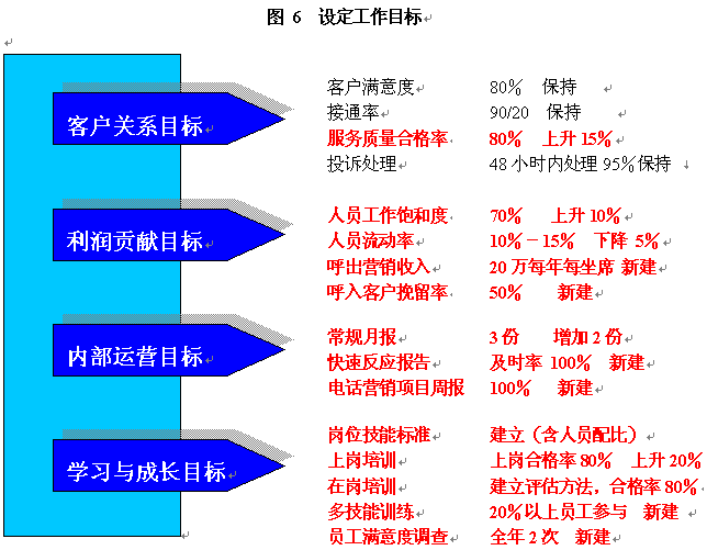 根據(jù)年度重點工作及目標(biāo),我們就可以設(shè)計關(guān)鍵措施來使其實現(xiàn)。通常一項關(guān)鍵措施可以有助于幾個目標(biāo)的達(dá)成。如建立培訓(xùn)體系,可以使得在崗培訓(xùn)、上崗培訓(xùn)、多技能訓(xùn)練以及崗位技能達(dá)標(biāo)率有所提升,而體現(xiàn)在業(yè)務(wù)上的效果則是服務(wù)質(zhì)量的提升、呼出營銷收入增加和客戶挽留率提高。