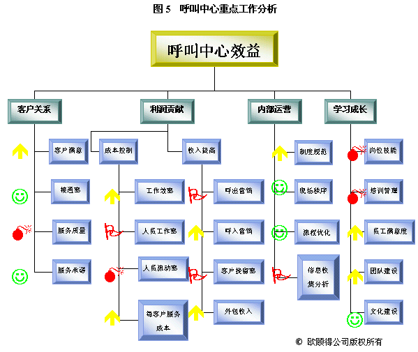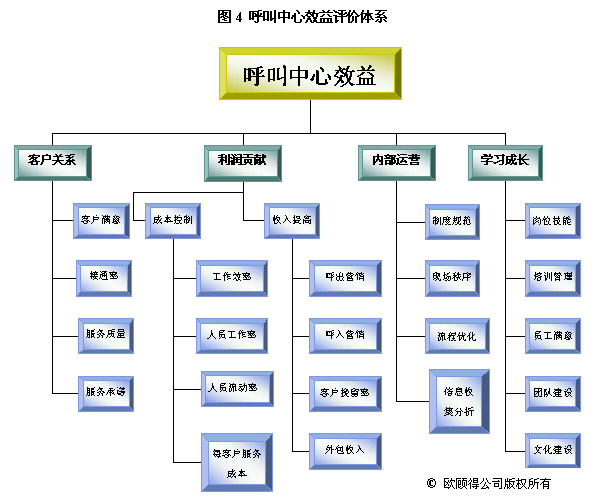根據(jù)電信運營商當(dāng)前的情況,結(jié)合平衡記分卡在呼叫中心的應(yīng)用,我們建議呼叫中心的效益評價體系如下:
