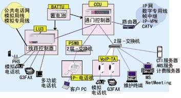 圖1顯示了一個IPstage系統(tǒng)的基本結(jié)構(gòu),IP PBX系統(tǒng)包含了通信控制器(CCU)、線路控制器(LU32)、以太網(wǎng)電話IP-TEL、連接普通電話的VoIP-TA適配器、后備電池,以及可直接連接PHS基站系統(tǒng)。通信控制器是IP