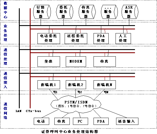 另一種方案是PDA和證券營(yíng)業(yè)部前端機(jī)(實(shí)際就是電話(huà)委托前端機(jī))采用FSK通訊方式,使用電話(huà)委托的通道來(lái)完成所有的委托查詢(xún)。這種方式的速度快,信息容量大,保密性強(qiáng),而且營(yíng)業(yè)部不需單獨(dú)申請(qǐng)電話(huà)線(xiàn)路,PDA和電話(huà)委托線(xiàn)路可動(dòng)態(tài)分配,使其電話(huà)線(xiàn)路得到最大限度的利用。另外,營(yíng)業(yè)部對(duì)外形象也好,只用一個(gè)號(hào)碼就可讓股民完成電話(huà)委托、PDA委托等多種委托方式,給股民帶來(lái)了方便。不過(guò)這種方式需要得到電話(huà)語(yǔ)音卡提供廠商的產(chǎn)品技術(shù)支持,語(yǔ)音卡必須同時(shí)支持標(biāo)準(zhǔn)的DTMF和FSK的方式,卡上有充足的能力來(lái)處理兩種方式,在語(yǔ)音處理卡的底層驅(qū)動(dòng)應(yīng)該將電話(huà)和PDA的委托區(qū)別開(kāi)來(lái),目前市場(chǎng)能夠完全支持這種應(yīng)用的只有深圳市東進(jìn)通訊技術(shù)股份有限公司的產(chǎn)品,東進(jìn)技術(shù)的新一代PCI系列語(yǔ)音卡數(shù)字卡和模擬卡都完全采用DSP(數(shù)字信號(hào)處理器)架構(gòu),卡上有專(zhuān)用DSP來(lái)處理DTMF和FSK的收發(fā),是目前PDA委托前端的最好選擇;這種方案還應(yīng)該得到證券電話(huà)委托系統(tǒng)的開(kāi)發(fā)商的支持,在電話(huà)委托系統(tǒng)里增加處理PDA委托的功能。目前恒基偉業(yè)的“股靈通”就是采用這種方式。