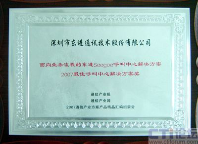 10月23日,中國國際通信設(shè)備技術(shù)展覽會(huì)國際通信展覽會(huì)開幕當(dāng)天,由通訊產(chǎn)業(yè)報(bào)社主辦的2007通信產(chǎn)業(yè)方案產(chǎn)品精品評(píng)選活動(dòng)頒獎(jiǎng)典禮隆重舉行,東進(jìn)技術(shù)的“面向業(yè)務(wù)流程的東進(jìn)Seegoe呼叫中心解決方案”榮獲2007最佳呼叫中心解決方案獎(jiǎng)。