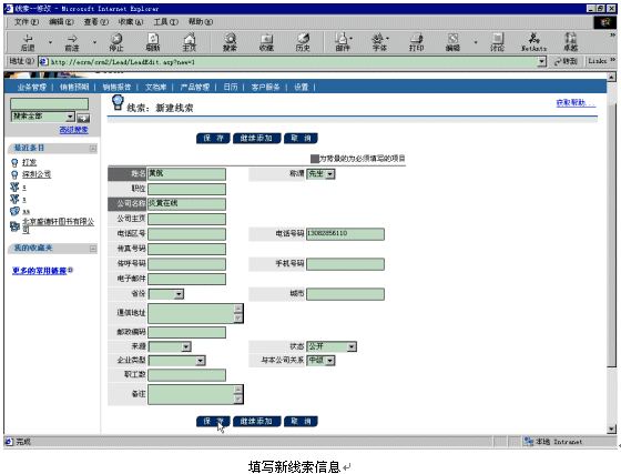。。比如現(xiàn)在有一個(gè)新客戶黃航的電話13082856110呼入Ebanswers呼叫中心,console控制臺接收到這個(gè)電話號碼以后,會產(chǎn)生一個(gè)URL鏈接地址tel=217,以參數(shù)的形式附在調(diào)用的CRM頁面http://ecrm/crm2/default.asp?retURL=http://ecrm/crm2/search/searchtel_xml.asp后面,當(dāng)話務(wù)員登錄以后,就會彈出相應(yīng)的添加新線索頁面,話務(wù)員填寫好相關(guān)信息后,按下"保存"按鈕就可以建立新線索了。