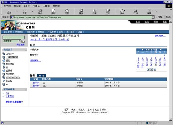 星際(杭州)網(wǎng)絡(luò)技術(shù)有限公司(www.ebanswers.com)研發(fā)的Ebanswers eCRM是中國第一套基于新一代網(wǎng)絡(luò)標準語言――XML的客戶關(guān)系管理系統(tǒng),整個系統(tǒng)提供了完善的企業(yè)級客戶關(guān)系全面解決方案,包含可無縫整合又可獨立運行的三個功能組件:銷售,營銷,服務(wù)流程自動化軟件系統(tǒng);客戶溝通集成信息化方案;深層商業(yè)智能分析。