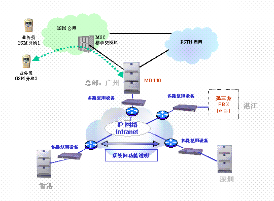 經(jīng)公司授權的業(yè)務人員在客戶現(xiàn)場辦理業(yè)務時, 簡化了撥打某一個連接公司交換系統(tǒng)的專用號碼,經(jīng)身份認證后再撥打長途的過程,他們可以直接用已注冊好的手機象普通分機一樣進行長途通話.外地業(yè)務人員的手機與公司總部及各分支機構的通話均通過公司專網(wǎng)(VoIP),節(jié)約了長途通信費用。