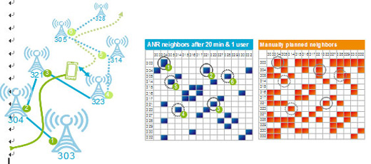 ANR盡管目前在LTE還沒有商用,但在多個歐美運營商的測試中,愛立信產品表現(xiàn)良好。如下圖ANR測試中,僅使用一個移動終端在20分鐘內通過了20個基站覆蓋區(qū)域,檢測到的鄰區(qū)關系如藍圖所示,相比橙色圖的手工配置鄰區(qū),所有必要的鄰區(qū)關系(有數字標示)悉數獲得。而且這僅僅動用了一個終端,如果相關區(qū)域內都有終端分布,檢測的速度會有極大提高。