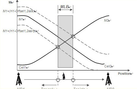 過早、過晚切換是由于目標小區(qū)切換門限過低和過高所致。對應過早和過晚臨界切換門限之間的區(qū)間就是合理的移動性優(yōu)化范圍。頻內的負載均衡也可以通過調整切換門限值來引導用戶和負荷由高負荷小區(qū)遷移至低負荷小區(qū),很顯然可調的門限區(qū)間就是移動性優(yōu)化允許的范圍。這個范圍對應相鄰小區(qū)的重覆蓋面積,在LTE中理論上大概相當于正常小區(qū)面積的15%,可操作的價值不是很大。愛立信更傾向于異頻或者異系統(tǒng)的負荷均衡方案,增益比較明顯。如下圖,一個終端從左至右移動,M1、M2分別是接收到eNB1和eNB2的信號強度曲線,兩條曲線相交點對應的地理位置處終端接收到的信號強度相同,對cell1到cell2的切換,下面的虛線對應過早切換臨界,上面的虛線對應過晚切換臨界,兩線與M2相交點對應合理切換門限區(qū)間,也是頻內負載均衡MLB的可調范圍。