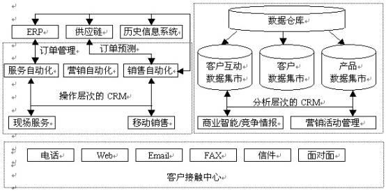 正如圖1所示,現(xiàn)在一般認(rèn)為,目前的CRM產(chǎn)品分為這樣基本的三類:分析型CRM(圖中的分析層次的CRM)、運(yùn)營(yíng)型CRM(圖中的操作層次的CRM)和交互型CRM(圖中的客戶接觸中心)。交互型CRM主要在于建立一個(gè)企業(yè)與用戶的交互、溝通渠道,如電話、傳真、Web、Email、短消息、面對(duì)面接觸;運(yùn)營(yíng)型CRM主要在于運(yùn)行企業(yè)的市場(chǎng)營(yíng)銷、銷售和服務(wù)的自動(dòng)化應(yīng)用,記錄客戶的基本信息和互動(dòng)信息;而分析型CRM則在于分析完整客戶信息(包括靜態(tài)的客戶基本信息和動(dòng)態(tài)的客戶交互信息),掌握和預(yù)測(cè)客戶的個(gè)性化需求,并開(kāi)展相應(yīng)的營(yíng)銷和銷售活動(dòng),提供相應(yīng)的服務(wù)和支持。