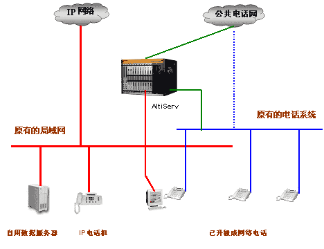 員工的電話有兩種選擇,一是傳統(tǒng)的模擬電話,以傳統(tǒng)的交換機(jī)布線方式,接普通的模擬電話線(雖然外表一樣,但它其實(shí)已經(jīng)是從Altiserv接出的網(wǎng)絡(luò)電話)。二是采用IP數(shù)字電話,以網(wǎng)線方式插入局域網(wǎng)的端口或集線器。在辦公室內(nèi)使用IP數(shù)字電話和普通模擬電話沒有多大的區(qū)別;兩種電話還可以在一個Altiserv下同時使用。