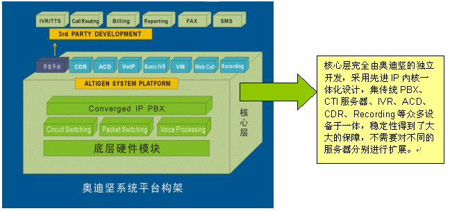 值得一提的是,在穩(wěn)定性上,奧迪堅IP一體化呼叫中心平臺系統(tǒng)構(gòu)架,從產(chǎn)品設(shè)計之初就突破了以住基于交換機或板卡的傳統(tǒng)模式,在一臺通訊服務(wù)器上高度融合了呼叫中心的所有常用功能,有效避免了復(fù)雜的網(wǎng)絡(luò)連接和眾多的各類交換機和外掛設(shè)備,各個設(shè)備相對獨立兼容性差所給呼叫中心系統(tǒng)所帶的穩(wěn)定性欠佳的隱患。除此之外,奧迪堅呼叫中心系統(tǒng)底層硬件模塊是在美國設(shè)計生產(chǎn)的,通過北美和中國的嚴(yán)格的電信入網(wǎng)測試;相對于硬件,平臺軟件也都是由奧迪堅自主開發(fā)設(shè)計的,針對不同的硬件采用不同的驅(qū)動模塊,軟硬一體在交換層又使用統(tǒng)一的邏輯接口,結(jié)構(gòu)清晰,層次合理,不僅保障了穩(wěn)定而且便于擴(kuò)展(如下圖所示),整個系統(tǒng)作為一個整體統(tǒng)一擴(kuò)展,不需要對不同的服務(wù)器分別進(jìn)行擴(kuò)展,有效避免了傳統(tǒng)呼叫中心構(gòu)建方式在擴(kuò)展方面存在的復(fù)雜性問題以及高額的擴(kuò)展費用。