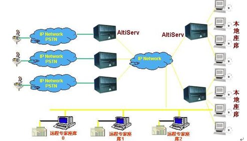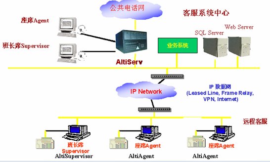 這種組合節(jié)省管理成本,因?yàn)樗械淖瘑T都在一點(diǎn),便于管理控制,同時用戶只要撥打本地電話即可進(jìn)入系統(tǒng)接收服務(wù),如需人工座席應(yīng)答的話系統(tǒng)會自動將來電通過Internet轉(zhuǎn)接到座席員處,對公司的話費(fèi)成本也較低(都是通過Internet實(shí)現(xiàn)的長途轉(zhuǎn)接功能)。同時AltiGen也支持通過IP分機(jī)的方式遠(yuǎn)程登錄到系統(tǒng)實(shí)現(xiàn)遠(yuǎn)程座席的功能,這樣對有些高級話務(wù)員或?qū)<易,不必每天到公司上班,可以通過家里的電腦登錄到AltiGen系統(tǒng),作為系統(tǒng)的一個分機(jī)來完成所有的座席員的功能,在他的電腦屏幕上也能彈出來電人的信息。系統(tǒng)的組網(wǎng)圖如下: