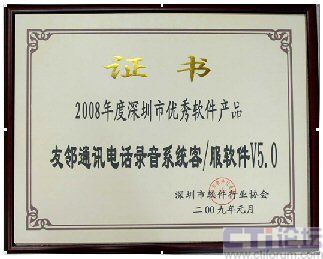 2009年1月,友鄰?fù)ㄓ嶋娫掍浺粝到y(tǒng)客/服軟件V5.0 榮獲由深圳市軟件行業(yè)協(xié)會(huì)頒發(fā)的“2008年度深圳市優(yōu)秀軟件產(chǎn)品”榮譽(yù)證書!2008年度深圳市優(yōu)秀軟件產(chǎn)品”的評選是深圳市軟件行業(yè)協(xié)會(huì)在全市范圍內(nèi)舉辦的軟件產(chǎn)品推優(yōu)活動(dòng),經(jīng)過了企業(yè)申報(bào)、技術(shù)資料審核、專家評審等等幾大嚴(yán)格篩選程序。