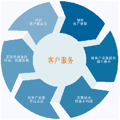 客戶服務(wù)不僅限于把公司提供給客戶使用?蛻舴⻊(wù)是與客戶交互的一個(gè)完整過程,包括聽取客戶的問題和要求,對(duì)客戶的需要作出反應(yīng)并探詢客戶新的需求。我們真的不能將其看成一個(gè)簡(jiǎn)單的過程?蛻舴⻊(wù)可以用一個(gè)復(fù)雜的循環(huán)來表示,其中不僅僅包括了客戶和客戶服務(wù)部門,實(shí)際上包括了整個(gè)公司,即把公司整體作為一個(gè)受客戶需求驅(qū)動(dòng)的對(duì)象。