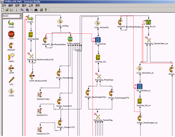 GVP提供了界面友好的功能強大的語音應(yīng)用開發(fā)工具-Genesys Studio,其中預(yù)定了豐富的控件,用來實現(xiàn)菜單語音播報、DTMF收集以及對數(shù)據(jù)庫查詢等諸多功能。通過拖放的方式就可以快速的隨心所欲地設(shè)計出你所需要的語音邏輯應(yīng)用流程,最終編譯產(chǎn)生用于發(fā)布的ASP或者JSP頁面。應(yīng)用之間可以彼此調(diào)用,提高了語音應(yīng)用的靈活性和可重用性。Genesys Studio還提供了靈活實用的調(diào)試工具,可以隨意設(shè)置斷點實時跟蹤流程的執(zhí)行情況,極大的方便了語音應(yīng)用流程的調(diào)試。