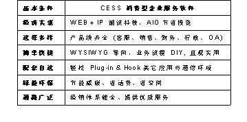 CESS消費(fèi)型服務(wù)軟件具有經(jīng)濟(jì)實惠、選擇多樣、簡單快捷、配套自選、綠能環(huán)通路廣泛等特點,采用Web+IP的潮流科技,AIO節(jié)省投資,使軟件經(jīng)濟(jì)實惠;CESS軟件產(chǎn)品線齊全,涵蓋客服、銷售、財務(wù)、行政、OA等很多方面,給您多樣選擇;WYSIWYG(所見即所得)導(dǎo)向,業(yè)務(wù)流程DIY,讓您至需要動動鼠標(biāo)就可以DIY您想要得到的設(shè)計,不再需要麻煩IT人員,只管實用,簡單快捷;輕松Plug-in & Hook其它應(yīng)用與通信環(huán)境,可根據(jù)您的需要配套自選;節(jié)能減碳、省話費(fèi)、省空間,綠色環(huán)保;經(jīng)銷體系健全、提供優(yōu)質(zhì)服務(wù),通路廣泛。