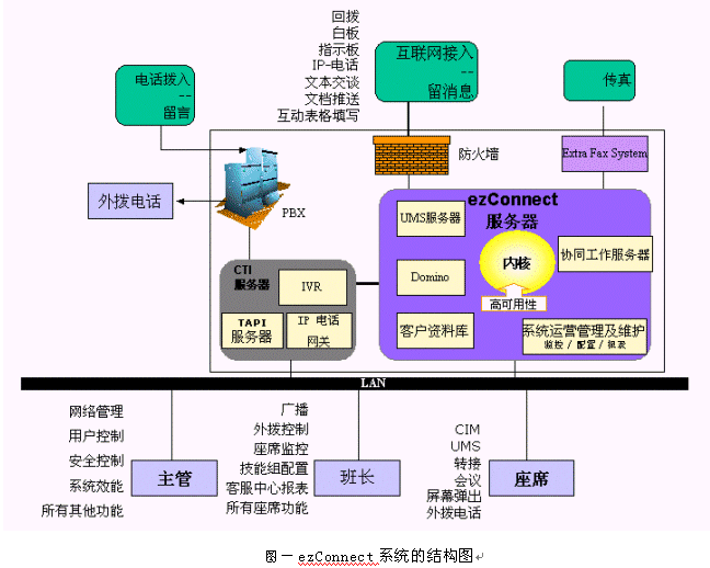 ezConnect系統(tǒng)是由訊泰信息科技公司的北京研發(fā)中心設(shè)計(jì)開發(fā)出來的一個(gè)成熟的多媒體呼叫中心產(chǎn)品。支持傳統(tǒng)電話、web、電子郵件、傳真、語音郵件、IP電話、短消息、WAP等用戶接入方式;對(duì)客戶請(qǐng)求采用基于座席技能的智能分派;提供文本交談、白板共享、協(xié)同填表、文檔推送、IP電話、短消息發(fā)送等多種實(shí)時(shí)交流工具;有非常實(shí)用的實(shí)時(shí)監(jiān)控和報(bào)表子系統(tǒng)。核心部分的設(shè)計(jì)采用分離分層的思想,實(shí)現(xiàn)了相對(duì)于PBX、IVR、CRM的透明性。系統(tǒng)的配置非常靈活,可以在很短的時(shí)間內(nèi)完全改變整個(gè)客戶端的風(fēng)格,或支持一種新的語言。整個(gè)系統(tǒng)建立在Java平臺(tái)上,具有良好的可移植性。下面是ezConnect系統(tǒng)的結(jié)構(gòu)圖: