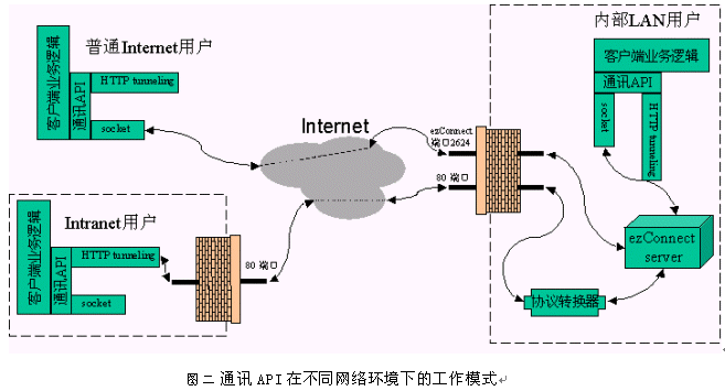 對(duì)于被企業(yè)防火墻所限制的Intranet用戶,情況略微復(fù)雜一些。如果企業(yè)防火墻已開放ezConnect的協(xié)議端口2624,那么此類Intranet用戶訪問ezConnect系統(tǒng)的情況與普通Internet用戶沒有區(qū)別。如果企業(yè)防火墻限制ezConnect的協(xié)議端口,但允許HTTP協(xié)議通過,那么上文中提到的API會(huì)自動(dòng)選用HTTP隧道的通信方式來維護(hù)客戶端軟件與服務(wù)器軟件之間的連接。此時(shí),通信的效率會(huì)相對(duì)低一些,但對(duì)于可以透明地、完整地獲取Internet呼叫中心服務(wù)(文本交談、白板共享、IP電話等)的Intranet用戶來講是完全可以接受的。如果企業(yè)防火墻同時(shí)禁止ezConnect的協(xié)議端口2624和HTTP協(xié)議的默認(rèn)端口80,Intranet用戶將無法訪問ezConnect系統(tǒng)。而事實(shí)上,嚴(yán)格到不允許HTTP協(xié)議通過的防火墻是非常少見的,因此目標(biāo)4也不成為問題。