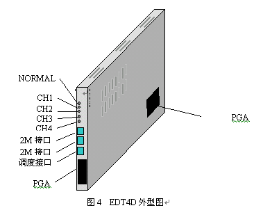 EDT4D是在舊EDT4板上增加調度接口。見圖4,EDT4D為一塊H20-20交換機插板,厚度為兩個槽口。EDT4通過扁平電纜與交換機公共控制機柜的背板PGA相連,提取交換機時隙;并將時隙轉換為由四個數(shù)字中繼接口E1組成的準V5.2接口與遠端模塊相連。一塊EDT4可接2個PGA端口組,共128個話路。