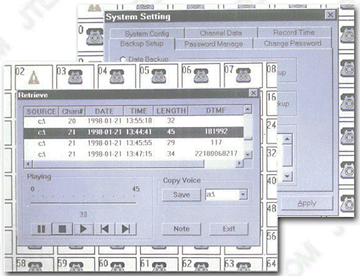 可按通道號(hào),日期,時(shí)間,撥出電話號(hào)碼四種條件進(jìn)行單個(gè)和組合查詢(xún),查詢(xún)方便快捷,數(shù)據(jù)表的下邊還顯示出數(shù)據(jù)資料的統(tǒng)計(jì)?梢匀我獠シ乓粋(gè)錄音或選擇多個(gè)錄音依次播放,放音時(shí)將彈出當(dāng)前語(yǔ)音文件的放音進(jìn)度等信息 |