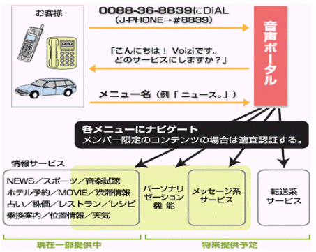 首先撥星號*(0088-36-8839,J-PHONE是#8839),接通后則是VOIZI主菜單,在電話員小姐的導(dǎo)播之后您可說出您希望的菜單,即可連接。之后再根據(jù)導(dǎo)播說出自己的希望,繼續(xù)進行使用。