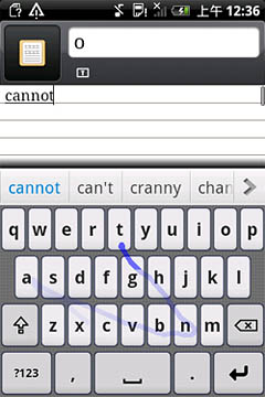 如圖所示,Nuance T9 Trace英文輸入方案對于各種不同的字母組合都能有效識別,像“google”這種既有連續(xù)又有間斷重復字母的單詞也不在話下,一次就能精準輸出。另外,該輸入法還可以省去標點符號,如“don"t”“can"t”等單詞,用戶只需滑觸“d-o-n-t”這四個字母,輸入法就會自動識別。