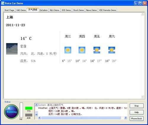 比方說(shuō)這個(gè)關(guān)于空調(diào)問(wèn)題,我們過(guò)去,空調(diào)的命令詞是“把空調(diào)打開(kāi),空調(diào)溫度提高3度!爆F(xiàn)在我也可以這樣說(shuō),空調(diào)調(diào)高一點(diǎn),我有點(diǎn)冷,也可以。就是你在車(chē)?yán)镞呁耆梢杂媚阕约旱恼Z(yǔ)言來(lái)說(shuō)你想干的事。比如說(shuō),前邊你不知道明天天氣會(huì)怎么樣,人一般都會(huì)想想,明天天氣如何,或者是告訴我天氣預(yù)報(bào)。但是你也可以這樣說(shuō)。明天會(huì)下雨嗎?也可以這樣說(shuō)。或者你這樣說(shuō),你說(shuō),今天大盤(pán)怎么樣。完全是用自然語(yǔ)言來(lái)說(shuō)。堵不堵車(chē),“查詢交通情況。”這就是,實(shí)際上可以有各種不同的說(shuō)法來(lái)完成這個(gè)任務(wù),這是我們自然語(yǔ)言的一個(gè)演示。