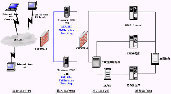 展現(xiàn)層實(shí)現(xiàn)定制化的、支持各種接入設(shè)備的統(tǒng)一消息平臺(tái)是非常必要的,它必將極大地促進(jìn)公司服務(wù)產(chǎn)品的發(fā)展。在展現(xiàn)層我們還強(qiáng)調(diào)企業(yè)信息門(mén)戶(hù)的建立:信息不是孤立的,需要一個(gè)統(tǒng)一的、互動(dòng)的、個(gè)性化的、全面的綜合表現(xiàn)形式,以更方便公司人員對(duì)信息的獲取,作出正確的決策。使用ASP.Net和OfficeXP Web Components OLAP展示工具,并能有機(jī)的與辦公自動(dòng)化工具結(jié)合起來(lái)。