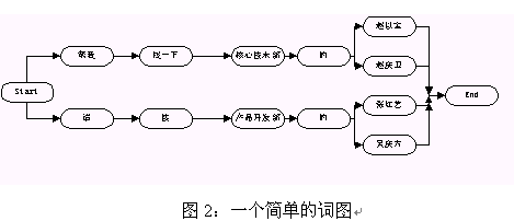 在語(yǔ)音識(shí)別中,語(yǔ)言模型是用來指導(dǎo)引擎進(jìn)行語(yǔ)音識(shí)別的,它限定了一個(gè)識(shí)別引擎所能表達(dá)的語(yǔ)句類型。在我們常用的圖搜索引擎中,語(yǔ)言模型是通過語(yǔ)法來表示的,語(yǔ)法是由一系列表示某個(gè)領(lǐng)域的語(yǔ)言表達(dá)方式的規(guī)則組成的(語(yǔ)法的具體書寫規(guī)則見引擎使用說明書)。這些規(guī)則會(huì)被被轉(zhuǎn)換成詞圖的形式然后用來指導(dǎo)語(yǔ)音的識(shí)別。所謂的詞圖是指由詞作為節(jié)點(diǎn)的一個(gè)圖,從該圖的開始節(jié)點(diǎn)到末尾節(jié)點(diǎn)的任一條路徑都是一個(gè)有效合法的句子。圖2給出了一個(gè)簡(jiǎn)單的詞圖。