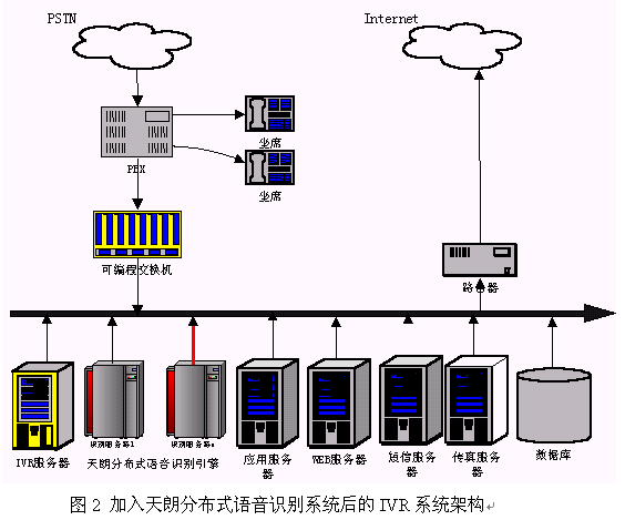 硬件連接:天朗分布式語(yǔ)音識(shí)別系統(tǒng)是通過(guò)局域網(wǎng)來(lái)把客戶(hù)端和服務(wù)器連在一起。因此在硬件上把天朗分布式語(yǔ)音識(shí)別系統(tǒng)聯(lián)入到IVR的一種簡(jiǎn)單的辦法是把引擎的所有服務(wù)器接入到系統(tǒng)現(xiàn)有的局域網(wǎng)中,使得識(shí)別服務(wù)器能和IVR服務(wù)器通過(guò)TCP/IP通訊即可。連接后的系統(tǒng)架構(gòu)可以用圖2來(lái)表示。
