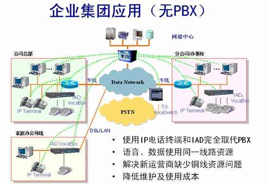 - 專網用戶通過VOIP,可組成一個大的IP PBX系統,使圖像、數據、語音通過統一網絡傳送,做到三網合一,有效利用資源,提高效率;
