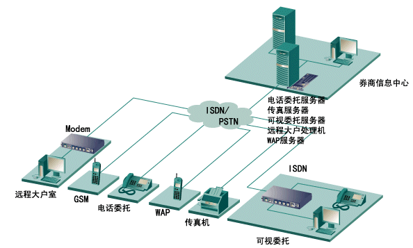 券商證券委托一般包括:電話傳真委托、可視委托(又稱遠(yuǎn)程大戶室)和網(wǎng)上委托等。其中除網(wǎng)上委托可通過Internet網(wǎng)外,其它委托必須通過PSTN網(wǎng)來連接。在當(dāng)前階段,此類委托占有最大的客戶群。以前,每個(gè)券商為了實(shí)現(xiàn)此類委 托,必須在券商中心的機(jī)器上安裝語音卡、傳真卡、座席卡來滿足電話傳真委托,另外還必須在另外一臺(tái)機(jī)器上安裝多串口卡和Modem Pool與座席卡相連來滿足可視委托,遠(yuǎn)程大戶室等業(yè)務(wù)。此方案,用戶不僅需要購買很多卡,占用很多機(jī)器插槽,而且在實(shí)現(xiàn)可視委托時(shí),只能接受客戶端PSTN模擬Modem的呼叫,而不能接收目前ISDN的連接方式,速度非常緩慢。本文主要提出了一種采用Eicon Diva Server PRI卡的新型解決方案,本方案不僅省去了在中心插上傳真卡、語音卡、座席卡多種卡,又省去了多串口卡和Modem Pool構(gòu)件,只需在中心的一臺(tái)機(jī)器插上1-4塊Diva Server PRI卡后,便能滿足你電話傳真委托、可視委托 、遠(yuǎn)程大戶室等多種業(yè)務(wù),還支持WAP呼叫,SMS短消息發(fā)送等,在可視委托和遠(yuǎn)程大戶室業(yè)務(wù)中,不僅支持PSTN Modem的模擬呼叫,也支持ISDN的數(shù)字呼叫,方案的性價(jià)比極高,方案連接圖如下圖所示: