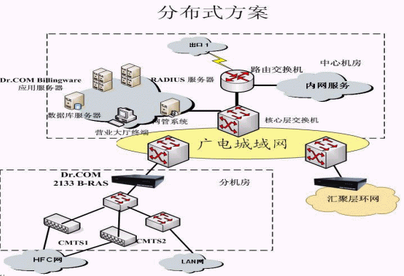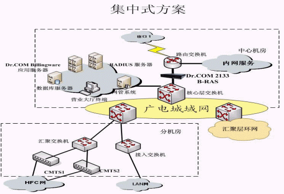 根據(jù)廣電城域網(wǎng)目前網(wǎng)絡(luò)的規(guī)模,以及以后的擴(kuò)展,采用集中接入認(rèn)證與計費,統(tǒng)一管理的方案,集中接入指:接入服務(wù)器部署在各個匯聚層的匯聚點,即在網(wǎng)絡(luò)出口安裝寬帶接入服務(wù)器,由寬帶接入服務(wù)器對所有用戶進(jìn)行身份認(rèn)證、接入控制、實時計費、數(shù)據(jù)采集,并將賬單和訪問日志等傳送至綜合業(yè)務(wù)系統(tǒng)。統(tǒng)一管理指在中心機房就可以進(jìn)行全部的管理,包括:網(wǎng)絡(luò)設(shè)備管理;用戶管理;經(jīng)營策略管理;賬務(wù)管理;安全管理;數(shù)據(jù)分析。提供完整的用戶資料分析,使用習(xí)慣分析,運營統(tǒng)計等詳細(xì)分析報表。
