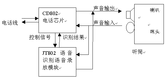 本方案主要由電話機(jī)芯片CD802加語(yǔ)音識(shí)別錄放模塊JT802構(gòu)成。