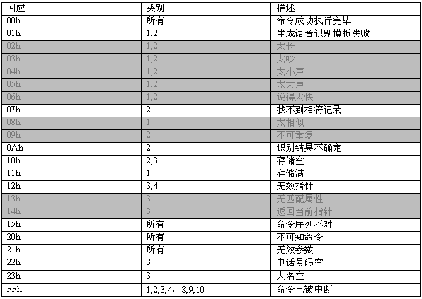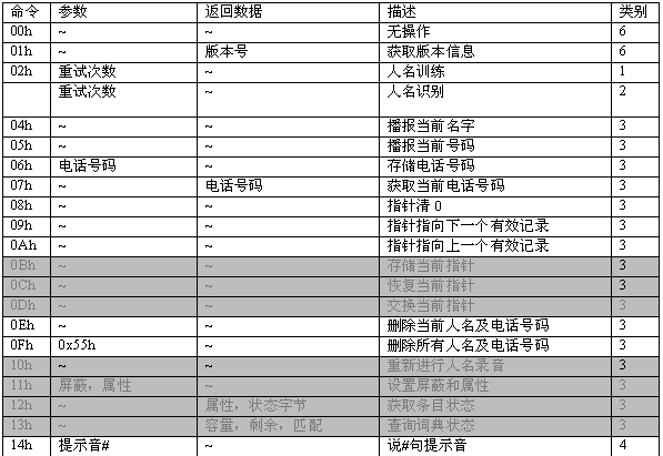 命令描述: 訓(xùn)練一個名字。當(dāng)增加一條電話本記錄時,應(yīng)先執(zhí)行此命令。該命令會生成一個語音模板,同時產(chǎn)生一個長達2秒的名字錄音。在此命令成功執(zhí)行之后,MCPU接著發(fā)送06h命令增加電話號碼。如果沒有執(zhí)行06h命令,則該項記錄電話號碼為空。
