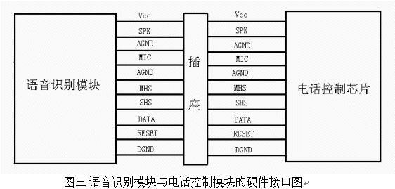 語音識別模塊與電話控制模塊以插卡形式連接,語音識別模塊上是10針的公座,電話控制模塊上是10針的母座。各引腳功能見圖三。