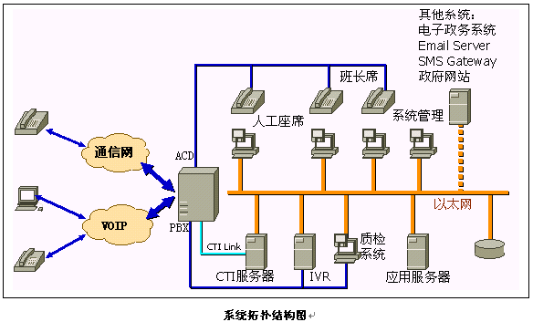 《政府呼叫中心系統(tǒng)》采用聲軟科技的《XCCP呼叫中心系統(tǒng)》平臺(tái),主要由PBX交換機(jī)、CTI服務(wù)器、IVR系統(tǒng)、應(yīng)用服務(wù)器、數(shù)據(jù)庫(kù)服務(wù)器、TTS系統(tǒng)和座席系統(tǒng)等硬件設(shè)備和系統(tǒng)應(yīng)用軟件組成。它以電話服務(wù)為主要服務(wù)方式、結(jié)合計(jì)算機(jī)信息系統(tǒng)的資料數(shù)據(jù),為用戶提供全方位的服務(wù)。