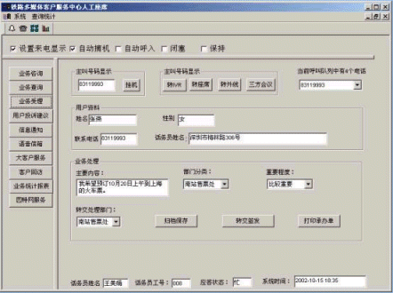 客戶打入電話后,當(dāng)系統(tǒng)的自動語音應(yīng)答子系統(tǒng)無法解決客戶問題時,客戶可選擇人工服務(wù),由鐵路客戶服務(wù)代表直接接聽客戶電話,處理并解決客戶問題。此時客戶同座席話務(wù)人員直接溝通,并同時記錄下該客戶的聯(lián)系方式,將相關(guān)數(shù)據(jù)添加入系統(tǒng)數(shù)據(jù)庫;也可以在數(shù)據(jù)庫的支持下回答國家和地方的鐵路信息及相關(guān)規(guī)定等的咨詢和疑問?蛻粢部梢赃x擇自動語音服務(wù)方式,根據(jù)系統(tǒng)的語音提示輸入按鍵,選擇類別,將自己的投訴和建議以及自己的聯(lián)系方式信息以留言錄音的方式保存在系統(tǒng)中。系統(tǒng)同時還支持自動傳真方式,客戶可以通過傳真機(jī)進(jìn)入本系統(tǒng),通過按鍵選擇傳真方式,將自己的意見建議等的文本內(nèi)容傳真給系統(tǒng),系統(tǒng)自動接受并存入數(shù)據(jù)庫。