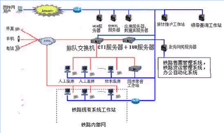 鐵路客戶服務(wù)中心系統(tǒng)主要是由帶語音板卡的計算機(jī)或排隊交換機(jī)、CTI服務(wù)器、IVR服務(wù)器、應(yīng)用服務(wù)器/數(shù)據(jù)庫服務(wù)器、人工座席系統(tǒng)等硬件設(shè)備和應(yīng)用軟件組成。它以電話服務(wù)為主要服務(wù)方式、結(jié)合計算機(jī)信息系統(tǒng)的資料數(shù)據(jù),為客戶提供全方位的服務(wù),包括業(yè)務(wù)查詢、業(yè)務(wù)咨詢、業(yè)務(wù)受理、投訴和建議、市場調(diào)查等功能。