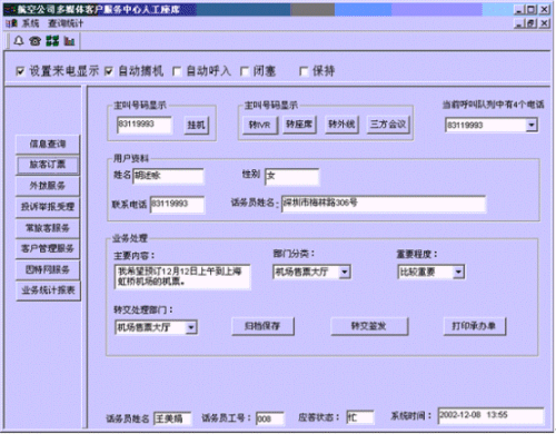 。。客戶打入電話后,當系統(tǒng)的自動語音應答子系統(tǒng)無法解決客戶問題時,客戶可選擇人工服務,由航空公司客戶服務代表直接接聽客戶電話,處理并解決客戶問題。此時客戶同座席話務人員直接溝通,并同時記錄下該客戶的聯(lián)系方式,將相關數(shù)據(jù)添加入系統(tǒng)數(shù)據(jù)庫;也可以在數(shù)據(jù)庫的支持下回答機場航班/航空貨運信息及相關規(guī)定等的咨詢和疑問、訂座/訂艙?蛻粢部梢赃x擇自動語音服務方式,根據(jù)系統(tǒng)的語音提示輸入按鍵,選擇類別,將自己的投訴和建議以及自己的聯(lián)系方式信息以留言錄音的方式保存在系統(tǒng)中。系統(tǒng)同時還支持自動傳真方式,客戶可以通過傳真機進入本系統(tǒng),通過按鍵選擇傳真方式,將自己的意見建議等的文本內容傳真給系統(tǒng),系統(tǒng)自動接受并存入數(shù)據(jù)庫。